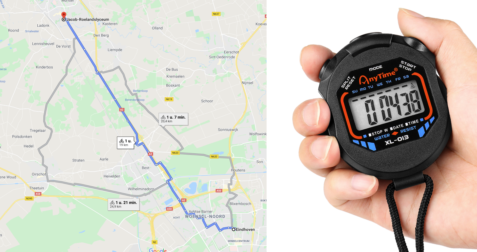 Een voorbeeld: een docent rijdt op een high-speed elektrische fiets van Eindhoven naar Boxtel, dat is 19 km, in 33 minuten. Hier zijn de gegevens dus s = 19 km en t = 33 minuten. De tijd moet worden omgezet naar uur, en omdat een uur 60 minuten heeft geldt hier dus: t = (33/60) h = 0,55 h. De gemiddelde snelheid is dan 19 / 0,55 = 34,5 km/h.