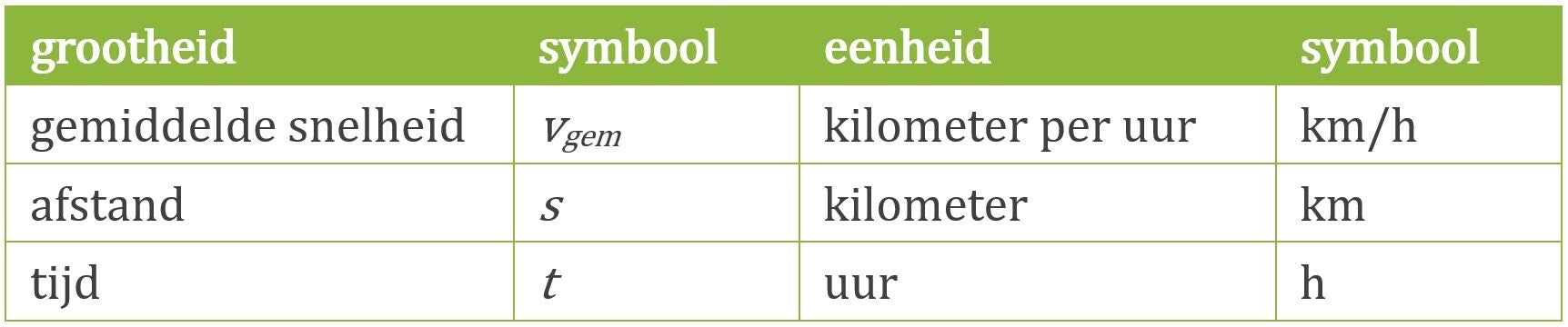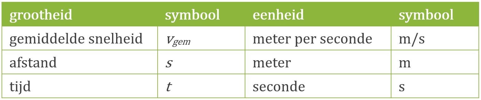 De gemiddelde snelheid kun je berekenen door de afgelegde afstand (s) te delen door de tijdsduur van de beweging (t). In de natuurkunde wordt voor snelheid meestal de eenheid meter per seconde (m/s) gebruikt. Je moet in de formule dan de afstand in meter (m) en de tijd in seconde (s) invullen.