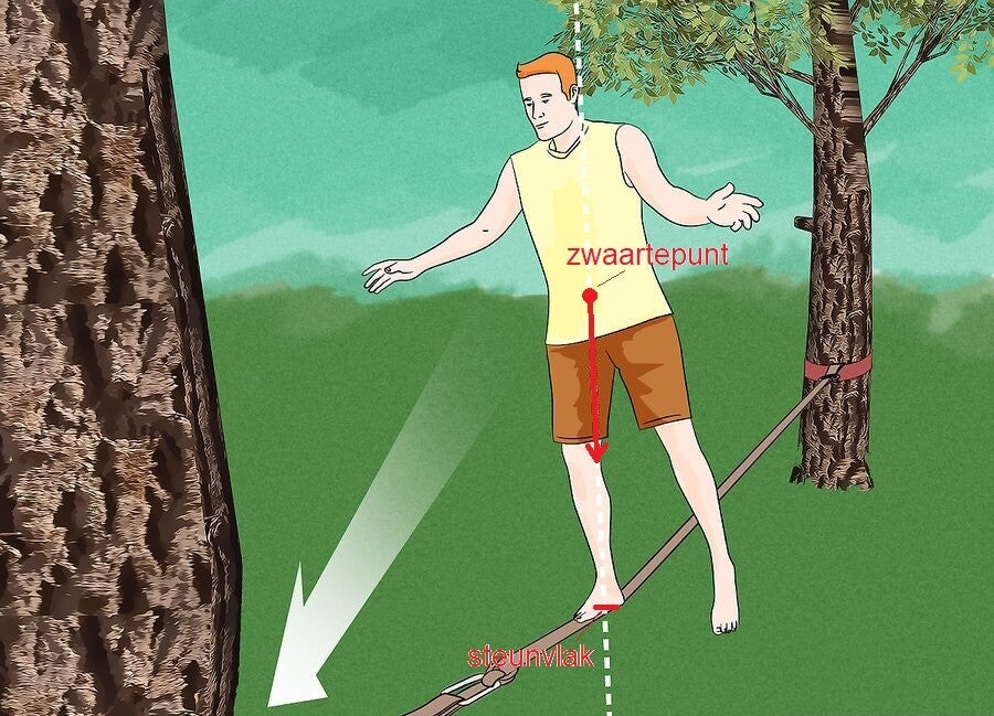 Bij slacklinen is het de kunst om het zwaartepunt boven het smalle steunvlak te houden.