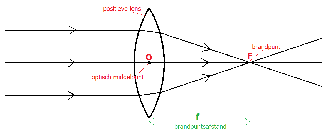 Positieve lenzen zorgen ervoor dat de lichtstralen meer naar elkaar toe gebogen worden. We noemen dit een convergerende werking. Wanneer je een evenwijdige lichtbundel op een positieve lens laat vallen dan komen de lichtstralen samen in het brandpunt van de lens. Dit punt wordt aangegeven met een hoofdletter F (van 'focal point'). Elke lens heeft aan beide kanten van de lens een brandpunt, deze ligt aan allebei de kanten even ver van het optisch middelpunt van de lens.