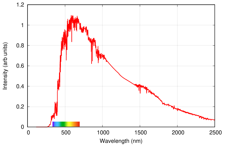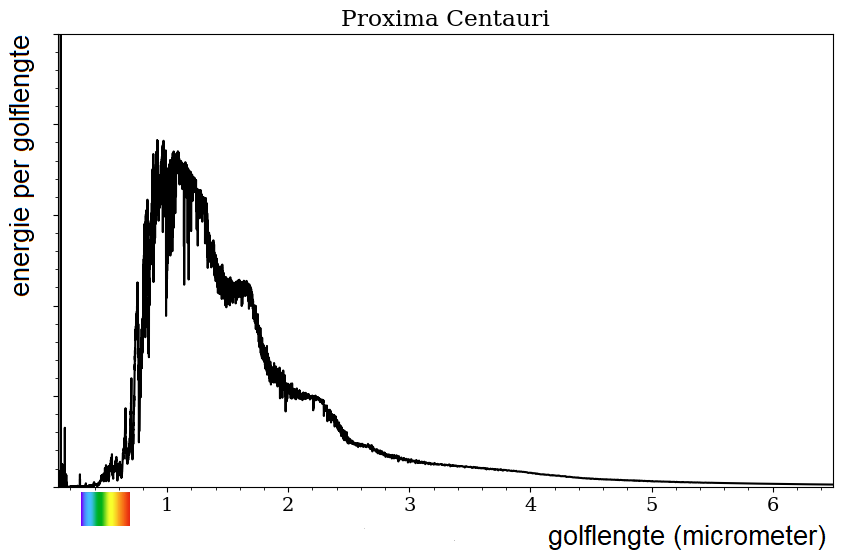 Spectrum van Proxima Centauri, er is ook aangegeven waar de golflengtes van het zichtbare licht zitten. Je ziet dat de ster nauwelijks blauw licht uitzendt, vrijwel alleen rood licht. De ster heeft daardoor een duidelijke rode kleur.
