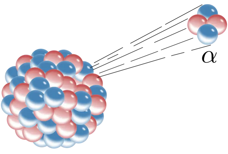 Bij alfastraling (aangegeven met de Griekse letter α) wordt er een α-deeltje uitgezonden. Dat deeltje bestaat uit twee protonen en twee neutronen, die loskomen uit de atoomkern. De atoomkern verandert hierdoor dus! Een α-deeltje is, relatief gezien, een groot en zwaar deeltje. Hierdoor kan hij bij een botsing veel schade aanrichten. Alfastraling heeft wel een zeer klein doordringend vermogen: een paar centimeter lucht of een velletje papier zijn al genoeg om α-deeltjes tegen te houden.
