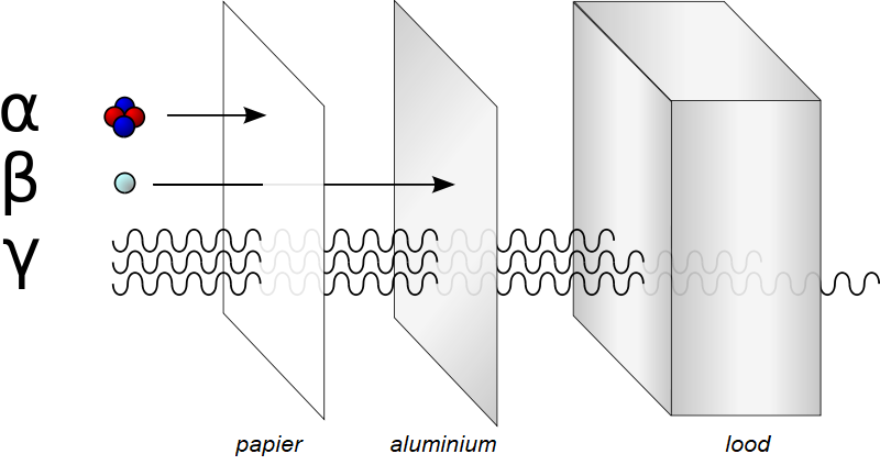 Doordringend vermogen van alfa-, bèta- en gammastraling.