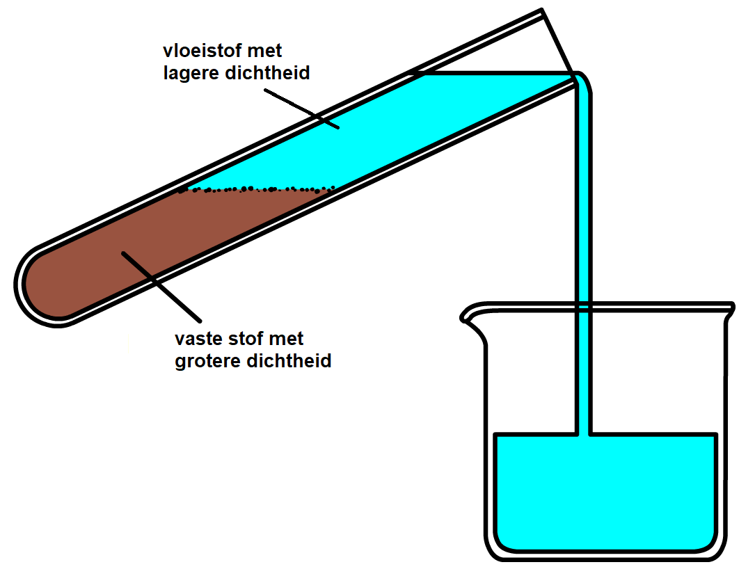 Bezinken: doordat de vaste stof niet blijft drijven kun je de vloeistof afschenken en zo de stoffen scheiden.