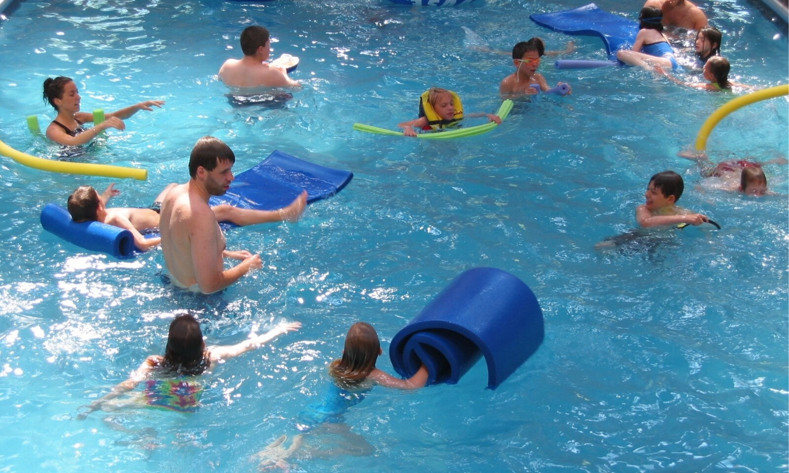 De rubberen matten in het zwembad blijven drijven omdat de dichtheid van het rubber kleiner is dan de dichtheid van het water.