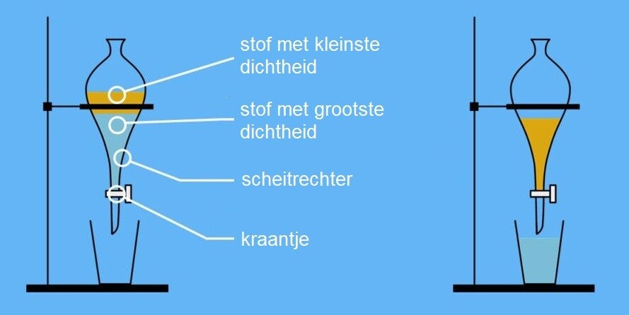 In de scheikunde wordt de stofeigenschap 'dichtheid' vaak gebruikt om mengsels van verschillende stoffen te kunnen scheiden. Wanneer je bijvoorbeeld een troebel mengsel hebt, dat bestaat uit een vloeistof en kleine stukjes vaste stof, dan kun je de vaste stof laten bezinken, de vaste stof zakt dan naar de bodem omdat hij een grotere dichtheid heeft. Door daarna de vloeistof af te schenken kun je de stoffen uit elkaar halen. Twee vloeistoffen die een verschillende dichtheid hebben kunnen gescheiden worden met een scheitrechter: wanneer je een tijdje wacht ontstaan er twee lagen. De stof met de grootste dichtheid zit dan onderin, en kun je met het kraantje aftappen.
